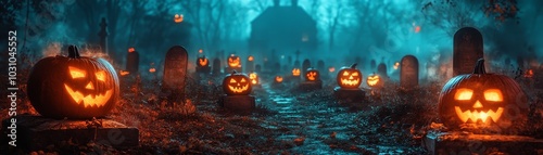 Naklejka premium Misty Halloween Scene with Pumpkins and Glow