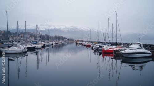 Fototapeta premium Misty harbor, boats moored, mountains background, calm waters, travel postcard