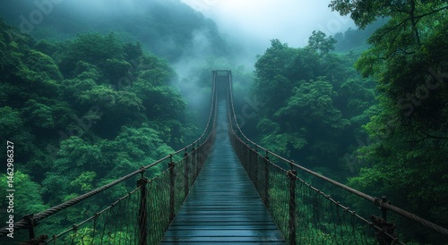 Obraz premium Misty jungle bridge pathway, nature exploration