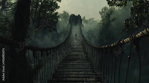© Anak, Fototapeta premium Misty jungle rope bridge spanning a deep chasm.