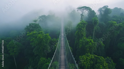 © Anak, Obraz premium Misty jungle suspension bridge amidst lush greenery.