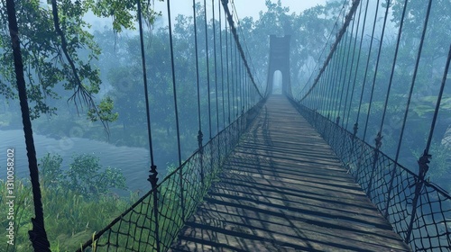 © affan, Obraz premium Misty jungle suspension bridge walkway