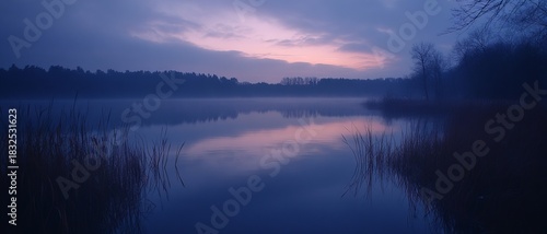 © Art Jabz, Fototapeta premium Misty lake at dawn/dusk, tranquil reflections