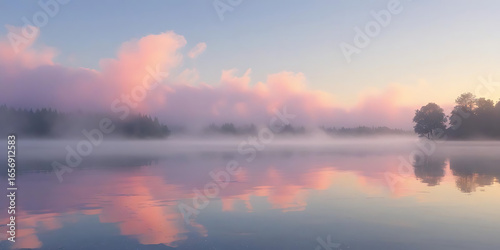 Fototapeta premium Misty Lake at Dawn with Pink Reflections