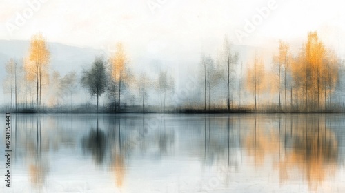 Obraz premium Misty Lake Autumn Landscape with Golden Trees