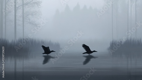 Fototapeta premium Misty Lake Birds Silhouette with Forest Dawn.