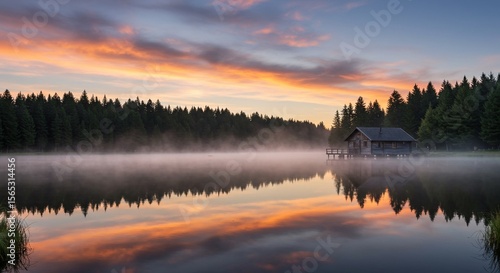 Fototapeta premium Misty lake cabin reflects dawns fiery sky