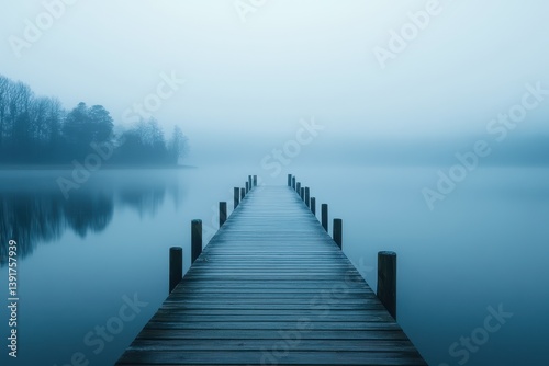 © Art IF, Fototapeta premium Misty Lake Dock Path. Calm tranquil scene