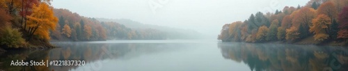 © boxs, Fototapeta premium Misty lake in autumn with yellowing leaves and grey sky, lakes, gray sky