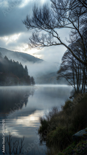 © Arties, Fototapeta premium Misty lake landscape with silhouettes of trees and reflections under cloudy sky