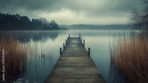 © Agang, Naklejka premium Misty lake pier, calm autumn morning, tranquil scene