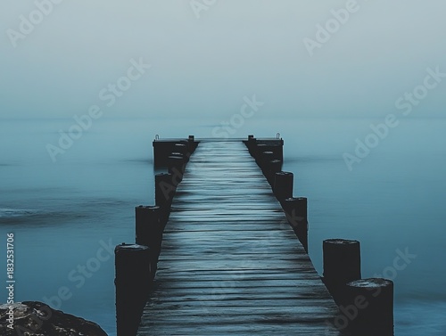 © Art Jabz, Obraz premium Misty lake pier extends into tranquil water