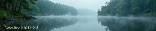 © Thitipa, Fototapeta premium Misty lake, rain on still water, wooded shore, brown, lake photography, water