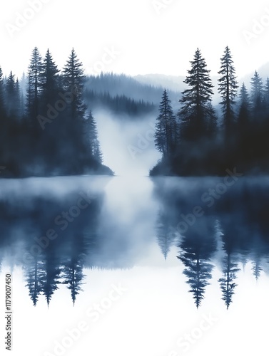 © tahu, Obraz premium Misty lake reflecting pine trees.