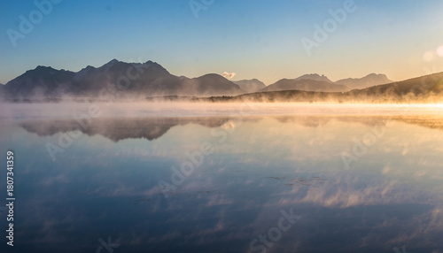 © jambulart, Obraz premium Misty lake reflects mountains at sunrise with golden light.