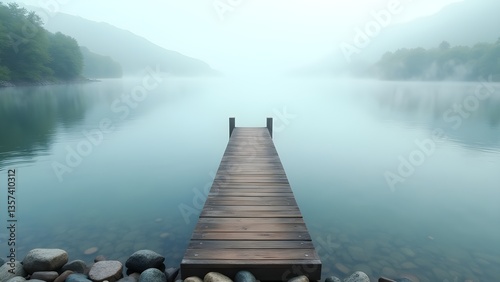 Naklejka premium Misty Lake Scene with Wooden Dock, Calming Water and Forest Backdrop on a...