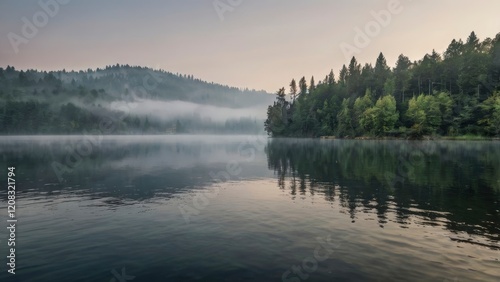 Fototapeta premium Misty Lake Serenity: Tranquil Dawn over Forested Shores