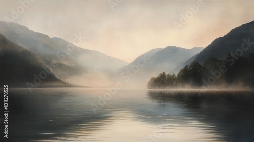 Fototapeta premium Misty lake sunrise in mountain valley.