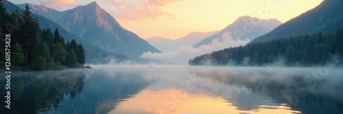 Fototapeta premium misty lake surface reflected serene mountain landscape at dawn with soft warm...