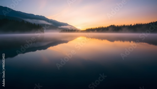 © ekalaila, Fototapeta premium Misty Lake with Mountain Silhouette at Sunset