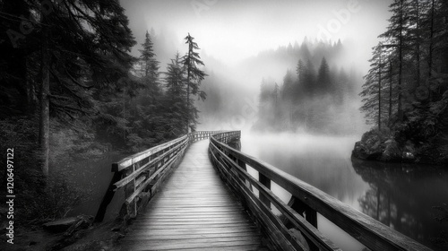 Naklejka premium Misty Lake with Wooden Bridge and Foggy Forest
