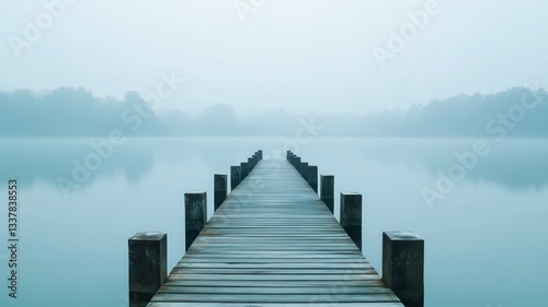 © Agang, Fototapeta premium Misty lake, wooden pier, tranquil scene, serene background, meditation