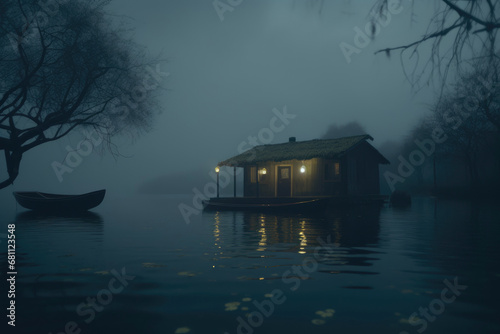 Fototapeta premium Misty Lakeside Abode at Dusk
