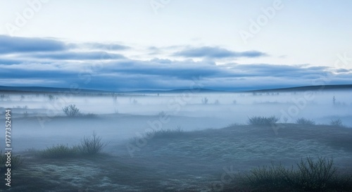 Fototapeta premium Misty landscape, low-lying fog over a plain, with a moody sky, at dawn or dusk