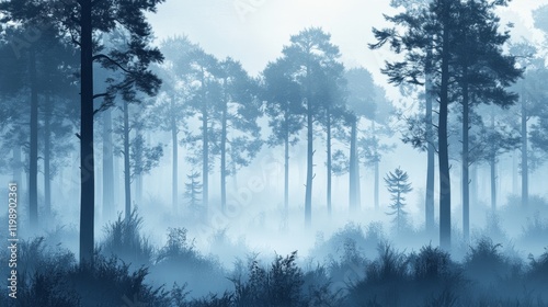 Fototapeta premium Misty landscape with fir forest in hipster vintage retro style