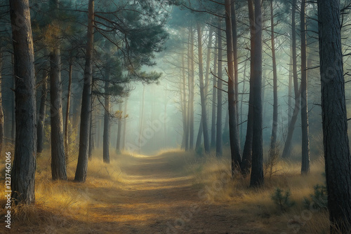 © Nobelus, Obraz premium Misty landscape with fir forest. Misty pine forest during sunrise