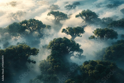 Fototapeta premium Misty landscape with trees shrouded in fog at dawn in a tranquil natural setting