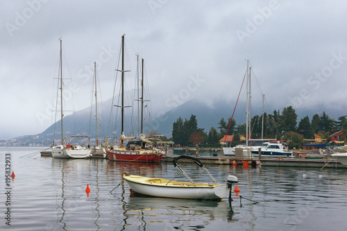Naklejka premium Misty Mediterranean landscape. Yachts and fishing boats on the water near seaside village of Seljanovo. Montenegro, Bay of Kotor (Adriatic Sea), Tivat