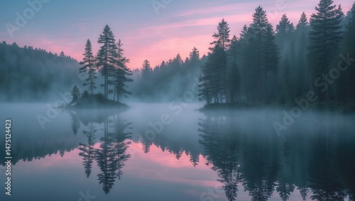 Fototapeta premium Misty morning at a calm lake with pine trees reflecting on tranquil water,...