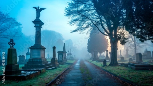 Naklejka premium Misty morning at a quiet cemetery with tall monuments and trees