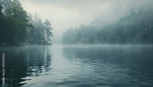 Fototapeta premium Misty morning at a serene lake, selective focus, quiet solitude, surreal,...