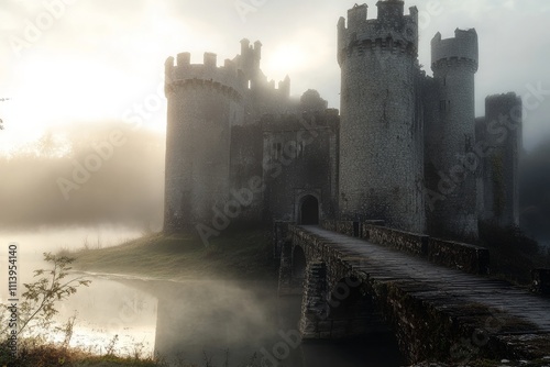 Fototapeta premium Misty morning at an ancient castle near water. Generative AI