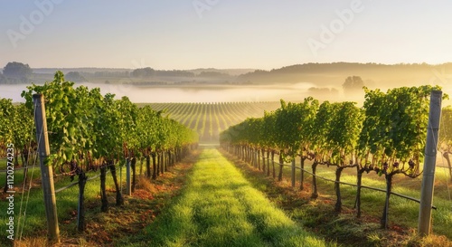 Naklejka premium Misty morning at lush vineyard with golden sunrise light