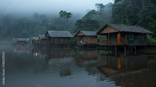 Fototapeta premium Misty morning cabins on a tranquil lake in a dense rainforest