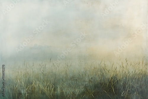 Obraz premium Misty morning field, soft light, muted colors, tranquil landscape.