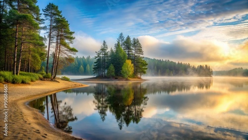 Fototapeta premium Misty Morning Fog Rolling Over Calm Lake Surface with Tall Pine Trees and Sandy Shore