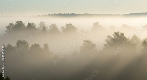 Fototapeta premium Misty Morning Forest Landscape with Sunlit Fog.