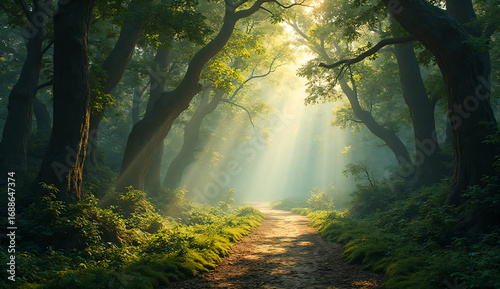 © wajid, Obraz premium Misty morning forest path with sunlight rays