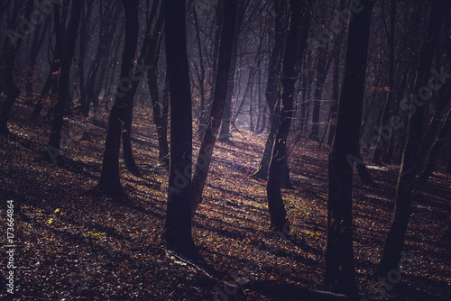 © salajean, Obraz premium Misty morning in a dark autumn forest