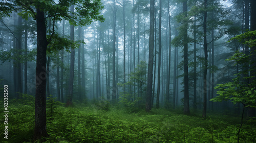 Obraz premium Misty morning in a dense forest.