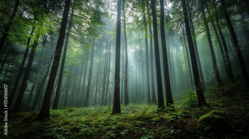 Naklejka premium Misty morning in a dense forest with sunlight peeking through the trees.