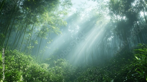 Obraz premium Misty morning in a lush bamboo forest with green foliage