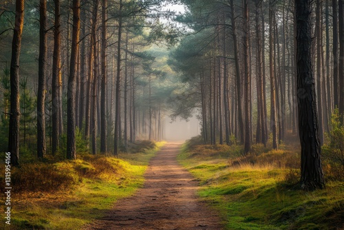 Fototapeta premium Misty morning in a majestic pine woodland with a tranquil footpath leading...