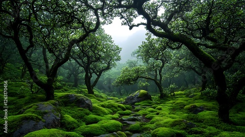 © Vu, Naklejka premium Misty Morning in a Mossy Forest Glen AI Generated