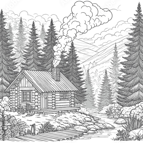 © Mamun, Fototapeta premium misty morning in a pine forest with a small wooden cabin and smoke coloring page