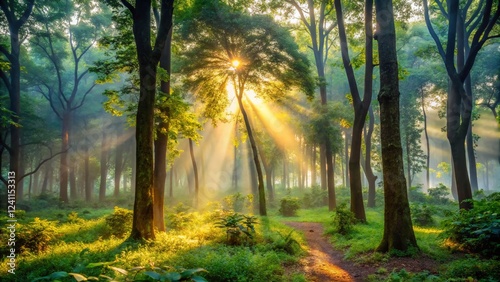 Fototapeta premium Misty Morning in Indian Forest: Sunlight Through Trees